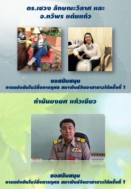 ดร.เชวง ลักษณะวิลาศ และ อ.ทวีพร แต้มแก้ว ขอสนับสนุน การแข่งขันโบว์ลิ่งการกุศล สมาพันธ์จิตอาสาชาวใต้ครั้งที่ 1 กํานันยงยศ แก้วเขียว ขอสนับสนุน การแข่งขันโบว์ลิ่งการกุศล สมาพันธ์จิตอาสาชาวใต้ครั้งที่ 1