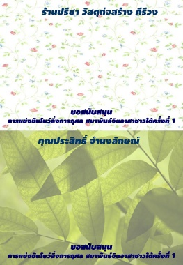 ร้านปรีชา วัสดุก่อสร้าง คีรีวง ขอสนับสนุน การแข่งขันโบว์ลิ่งการกุศล สมาพันธ์จิตอาสาชาวใต้ครั้งที่ 1 คุณประสิทธิ์ จํานงลักษณ์ ขอสนับสนุน การแข่งขันโบว์ลิ่งการกุศล สมาพันธ์จิตอาสาชาวใต้ครั้งที่ 1