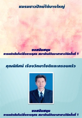 ชมรมชาวปักษ์ใต้บางใหญ่ ขอสนับสนุน การแข่งขันโบว์ลิ่งการกุศล สมาพันธ์จิตอาสาชาวใต้ครั้งที่ 1 คุณนิทัศน์ เรืองวิทยาโชติและครอบครัว ขอสนับสนุน การแข่งขันโบว์ลิ่งการกุศล สมาพันธ์จิตอาสาชาวใต้ครั้งที่ 1
