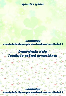 คุณเชาว์ ชูรักษ์ ขอสนับสนุน การแข่งขันโบว์ลิ่งการกุศล สมาพันธ์จิตอาสาชาวใต้ครั้งที่ 1 ร้านเชาว์เภสัช ท่าวัง โดยเสี่ยง้อ ธรวัฒน์ เลาหอารีคิลาน ขอสนับสนุน การแข่งขันโบว์ลิ่งการกุศล สมาพันธ์จิตอาสาชาวใต้ครั้งที่ 1