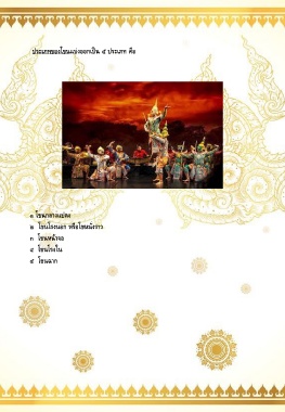 ประเภทของโขนแบ่งออกเป็น ๕ ประเภท คือ • ๑ โขนกลางแปลง ๒ โขนโรงนอก หรือโขนนั่งราว ๓ โขนหน้าจอ ๔ โขนโรงใน ๕ โขนฉาก