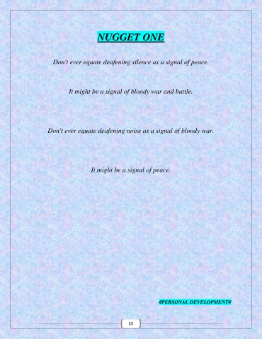 NUGGET ONE Don't ever equate deafening silence as a signal of peace. It might be a signal of bloody war and battle. Don't ever equate deafening noise as a signal of bloody war. It might be a signal of peace. #PERSONAL DEVELOPMENT# 15