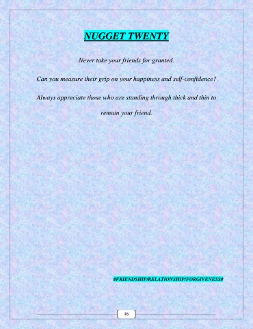 NUGGET TWENTY Never take your friends for granted. Can you measure their grip on your happiness and self-confidence? Always appreciate those who are standing through thick and thin to remain your friend. #FRIENDSHIP/RELATIONSHIP/FORGIVENESS# 36