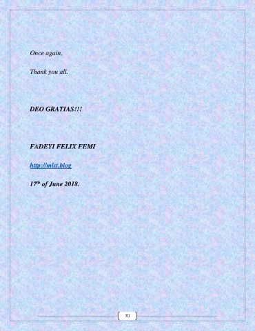 Once again, Thank you all. DEO GRATIAS!!! FADEYI FELIX FEMI http://mlst.blog th 17 of June 2018. 70
