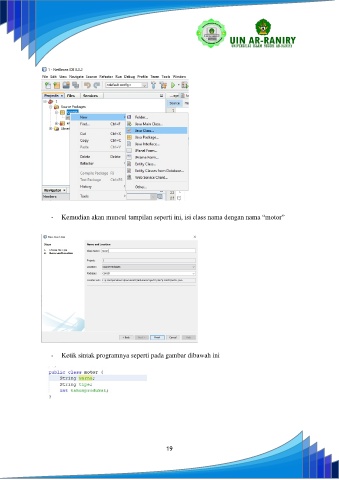 - Kemudian akan muncul tampilan seperti ini, isi class nama dengan nama “motor” - Ketik sintak programnya seperti pada gambar dibawah ini 19