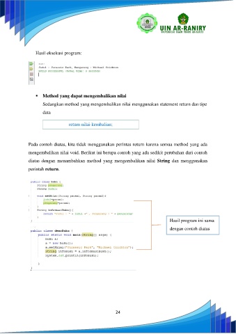 Sedangkan method yang mengembalikan nilai menggunakan statement return dan tipe