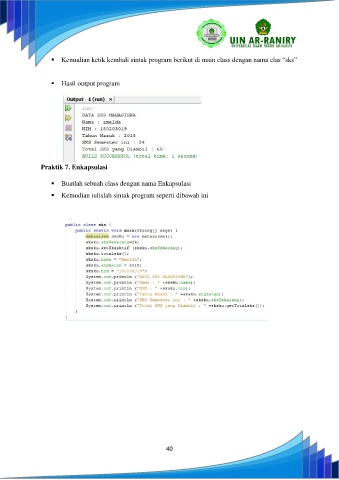 ▪ Kemudian ketik kembali sintak program berikut di main class dengan nama clas “sks” ▪ Hasil output program Praktik 7. Enkapsulasi ▪ Buatlah sebuah class dengan nama Enkapsulasi ▪ Kemudian tulislah sintak program seperti dibawah ini 40