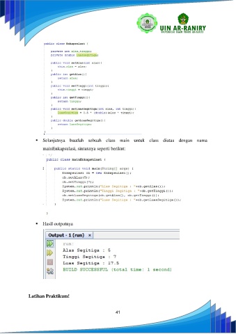 ▪ Selanjutnya buatlah sebuah class main untuk class diatas dengan nama mainEnkapsulasi, sintaxnya seperti berikut: ▪ Hasil outputnya Latihan Praktikum! 41