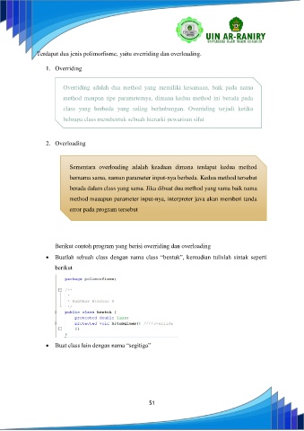 Terdapat dua jenis polimorfisme, yaitu overriding dan overloading.