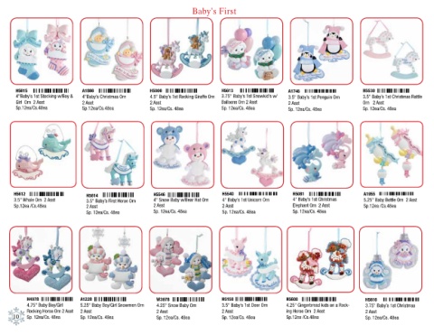 3.5" Whale Orn 2 Asst 3.5" Baby’s First Horse Orn 4" Snow Baby w/Bear Hat Orn 4" Baby’s 1st Unicorn Orn 4" Baby’s 1st Christmas 5.25" Baby Bottle Orn 2 Asst
