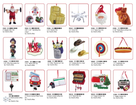 5.25" Wine Nutcracker Orn 3.75" "Wine Lover"Orn 4.5" Wine "Bucket List" Orn 3.5" Cowboy Hat Orn 3 Ass’ 3.5" Axe Throwing Orn 1.5" Frankfurter Orn