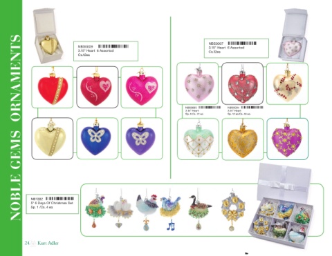 NOBLE GEMS ORNAMENTS NBS0007 NBS0009 3.15" Heart 6 Assorted 3.15" Heart 6 Assorted Cs.12ea Cs.12ea NBS0003 NBS0004 3.15” Heart 3.15” Heart Sp. 6 Cs. 72 ea Sp. 12 ea/Cs. 48 ea. NB1382 5" 6 Days Of Christmas Set Sp. 1 /Cs. 4 ea 24 Kurt Adler