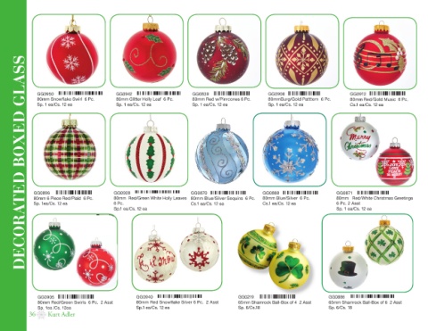80mm Red/Green Swirls 6 Pc. 2 Asst 80mm Red Snowflake Silver 6 Pc. 2 Asst 65mm Shamrock Ball-Box of 4 2 Asst 65mm Shamrock Ball-Box of 6 2 Asst