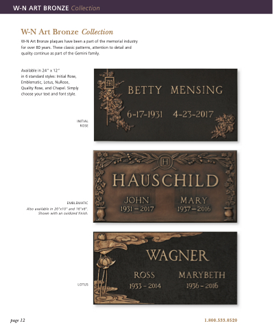 W-N Art Bronze plaques have been a part of the memorial industry for over 80 years. These classic patterns, attention to detail and quality continue as part of the Gemini family.