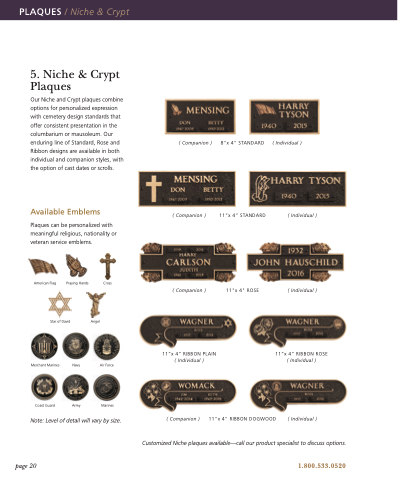 Our Niche and Crypt plaques combine options for personalized expression with cemetery design standards that offer consistent presentation in the columbarium or mausoleum. Our enduring line of Standard, Rose and Ribbon designs are available in both individual and companion styles, with the option of cast dates or scrolls.
