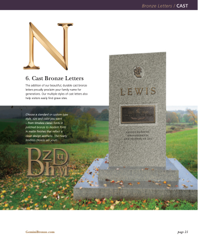 The addition of our beautiful, durable cast bronze letters proudly proclaim your family name for generations. Our multiple styles of cast letters also help visitors easily find grave sites.