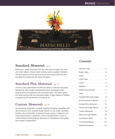 Memorial Sizes................................. 4 Border Styles.................................... 4 Scrolls .............................................. 5 Letter Styles ..................................... 5 Colors.............................................. 5 Epitaphs........................................... 6 Emblems and Artwork ..................... 6 Vases ............................................... 7 Standard Memorials Gallery ............. 8 W–N Art Bronze Collection ............ 12 Standard Plus Memorials................ 14 Portrait and Image Options ............ 16 Custom Memorials......................... 18 Niche and Crypt Plaques ................ 20 Cast Bronze Letters ........................ 21 Commercial Plaques....................... 22 General Information....................... 23