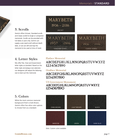 Gemini offers Unicast, Standard scrolls and Classic scrolls for single or companion memorials. Scrolls can be provided with full dates or year only. Gemini can supply a pre-need scroll without death date, or we can drill and tap the memorial to be used at time of need.