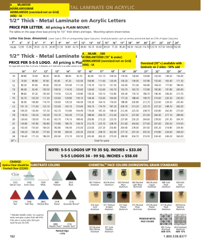 The tables on this page show base pricing for 1/2” thick letters and logos. Mounting options shown below.