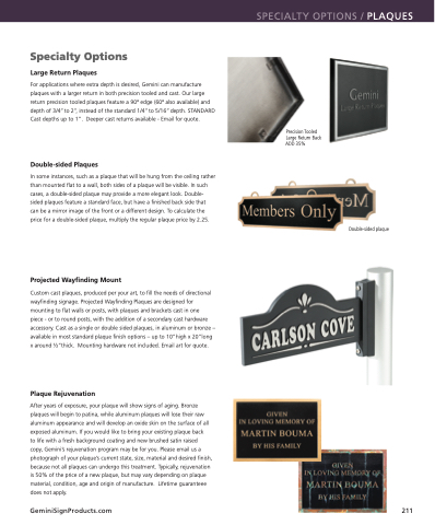 copy, Gemini’s rejuvenation program may be for you. Please email us a photograph of your plaque’s current state, size, material and desired finish, because not all plaques can undergo this treatment. Typically, rejuvenation is 50% of the price of a new plaque, but may vary depending on plaque material, condition, age and origin of manufacture. Lifetime guaranteee does not apply.