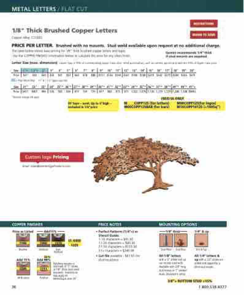 The table below shows base pricing for 1/8” thick brushed copper letters and logos. Use the COPPER FINISHES information below to calculate the price for any other finish.