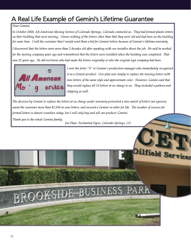 The decision by Gemini to replace the letters at no charge under warranty prevented a mix-match of letters (an eyesore), saved the customer more than $1,500 in new letters, and secured a Gemini re-seller for life. The number of sources for formed letters is almost countless today, but I will only buy and sell one product: Gemini.