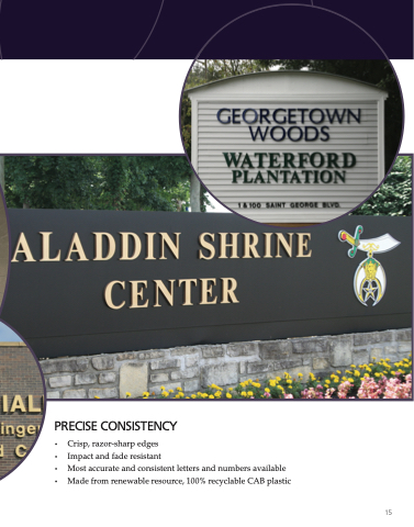 PRECISE CONSISTENCY • Crisp, razor-sharp edges • Impact and fade resistant • Most accurate and consistent letters and numbers available • Made from renewable resource, 100% recyclable CAB plastic 15