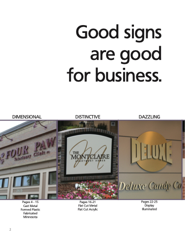 Good signs are good for business. DIMENSIONAL DISTINCTIVE DAZZLING 2 Pages 4 - 15 Cast Metal Formed Plastic Fabricated Minnesota Pages 16-21 Flat Cut Metal Flat Cut Acrylic Pages 22-25 Display Illuminated