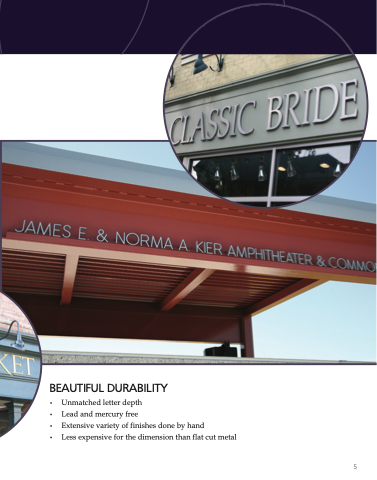 BEAUTIFUL DURABILITY • Unmatched letter depth • Lead and mercury free • Extensive variety of finishes done by hand • Less expensive for the dimension than flat cut metal 5