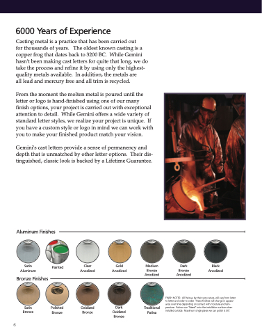 for thousands of years. The oldest known casting is a copper frog that dates back to 3200 BC. While Gemini hasn't been making cast letters for quite that long, we do take the process and refine it by using only the highest- quality metals available. In addition, the metals are