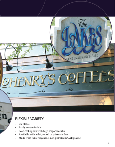 FLEXIBLE VARIETY • UV stable • Easily customizable • Low-cost option with high impact results • Available with a flat, round or prismatic face • Made from fully recyclable, non-petroleum CAB plastic 9