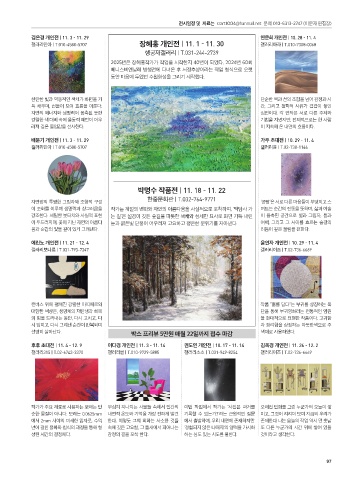 후후 초대전 | 11. 4 – 12. 9 이다경 개인전 | 11. 3 – 11. 14 권도연 개인전 | 10. 17 – 11. 14 김옥경 개인전 | 11. 26 – 12. 2