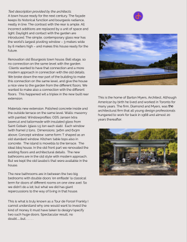 A town house ready for the next century. The façade keeps its historical function and bourgeois radiance, neatly in line. The contrast with the rear is ample. All incorrect additions are replaced by a unit of space and light. Daylight and contact with the garden are introduced. The simple, contemporary glass rear has the world’s largest pivoting window – 3 meters wide by 6 meters high – and makes this house ready for the future.