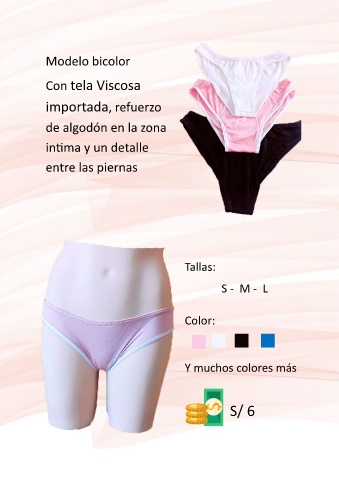 Modelo bicolor Con tela Viscosa importada, refuerzo de algodón en la zona intima y un detalle entre las piernas Tallas: S - M - L Color: Y muchos colores más S/ 6