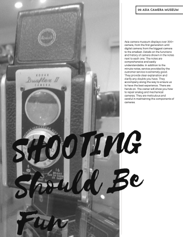 Asia camera museum displays over 300+ camera, from the first generation until digital camera; from the biggest camera to the smallest. Details on the functions and history of camera shown in the notes next to each one. The notes are comprehensive and easily understandable. In addition to the minute notes, service provided by the customer service is extremely good. They provide clear explanation and clarify any doubts you have. They accompany along the way to ensure us to have the best experience. There are hands on. The owner will show you how to repair analog and mechanical cameras. They are meticulous and careful in maintaining the components of cameras.