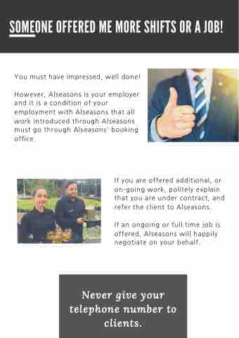 However, Alseasons is your employer and it is a condition of your employment with Alseasons that all work introduced through Alseasons must go through Alseasons' booking office.