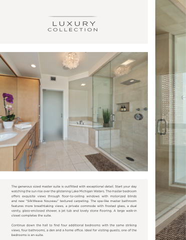 The generous sized master suite is outfitted with exceptional detail. Start your day watching the sun rise over the glistening Lake Michigan Waters. The master bedroom offers exquisite views through floor-to-ceiling windows with motorized blinds and new “SilkWeave Nouveau” textured carpeting. The spa-like master bathroom features more breathtaking views, a private commode with frosted glass, a dual vanity, glass-enclosed shower, a jet tub and lovely stone flooring. A large walk-in closet completes the suite.