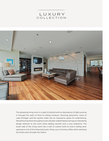 The sprawling living room is a sight to behold with an abundance of light pouring in through the walls of floor-to-ceiling windows. Stunning panoramic views of Lake Michigan and the skyline make this an impressive space for entertaining. Wood flooring flows throughout and a double-sided fireplace brings an interesting design element to the room while adding warmth and a cozy ambiance. The south side of the living room has a wall of custom built-ins and a sliding door opening to one of the three balconies. Enjoy your morning coffee while watching the boats pass through the harbor.