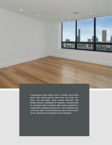 A generously sized master suite is a bright and inviting space with picture-worthy views from the large win- dows. The spa-caliber, Italian master bathroom with Kallista fixtures is designed for relaxation, including both an oversized walk-in starphire glass shower sheathed in marble with a separate soaking tub. Your expansive, Sex in the City, walk-in closets feature an array of custom built- ins for organization and display all your wardrobe.