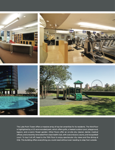 The Lake Point Tower offers a massive array of top tier amenities for its residents. The third floor is highlighted by a 2.5-acre wooded park, which offers grills, a heated outdoor pool, playground, lagoon, and a scenic flower garden. Other floors offer an on-site dry cleaner, dental, medical offices, and a recently renovated first-class health club, with a second pool, sauna, and racquetball court. To top it all off, head to the 70th floor to enjoy spectacular city views and fine dining at Cité. This building offers everything you could need without ever needing to step foot outside.