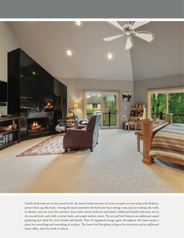 Family bedrooms are on the second level, the master bedroom suite of rooms occupies its own wing with fireplace, private deck, spa-like bath. Among the many amenities the bath suite has a sitting room, Jacuzzi soaking tub, walk- in shower, and two story his and hers closet with custom built-ins and island. Additional family bedrooms are on the second level, each with a private bath, and ample walk-in closet. The second level features an additional casual gathering spot ideal for close friends and family. Tons of organized storage space throughout the home means a place for everything and everything in its place. The lower level has plenty of space for recreation and an additional home office, ideal for work or school.