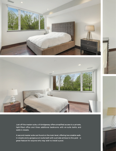 Just off the master suite, a lit bridgeway offers simplified access to a private, light-filled office and three additional bedrooms with en-suite baths and walk-in closets.