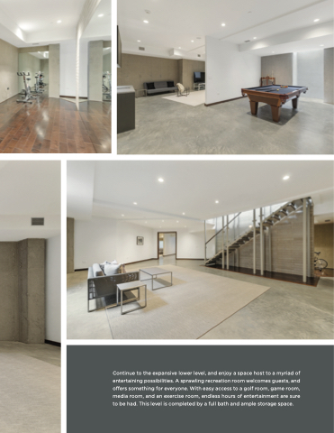 Continue to the expansive lower level, and enjoy a space host to a myriad of entertaining possibilities. A sprawling recreation room welcomes guests, and offers something for everyone. With easy access to a golf room, game room, media room, and an exercise room, endless hours of entertainment are sure to be had. This level is completed by a full bath and ample storage space.