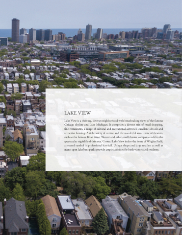 Lake View is a thriving, diverse neighborhood with breathtaking views of the famous Chicago skyline and Lake Michigan. It comprises a diverse mix of retail shopping, fine restaurants, a range of cultural and recreational activities, excellent schools and attractive housing. A rich variety of cuisine and the wonderful assortment of theaters, such as the famous Briar Street Theater and other small theater companies add to the spectacular nightlife of this area. Central Lake View is also the home of Wrigley Field, a revered symbol in professional baseball. Unique shops and large retailers as well as many open lakefront parks provide ample activities for both visitors and residents.