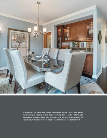 Continue to the third level, where the elegant formal dining area awaits. Entertaining is a breeze with a Dacor warming drawer and a Fisher Paykel dishwasher located nearby. Accompanied by a 500-bottle wine cellar, this space is sure to compel you to linger long after dinner has been served.
