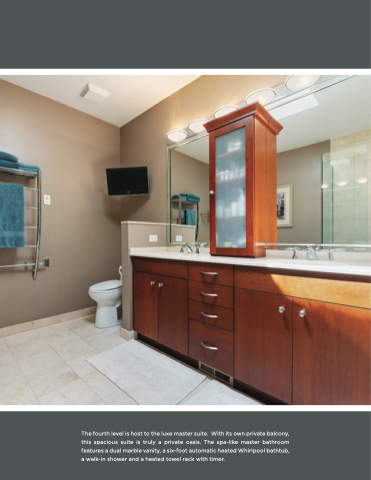 The fourth level is host to the luxe master suite. With its own private balcony, this spacious suite is truly a private oasis. The spa-like master bathroom features a dual marble vanity, a six-foot automatic heated Whirlpool bathtub, a walk-in shower and a heated towel rack with timer.