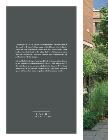 This gorgeous 3,000+ square foot townhome is ideally located in the heart of Chicago’s West Loop within Skinner school district and close to shopping and restaurants. This home boasts three bedrooms with the option for a fourth, three full bathrooms and two half bathrooms. High-end finishes are complimented by professional interior design.