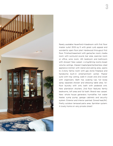 Rarely available Haverford 4-bedroom with first floor master suite! 3109 sq ft with great curb appeal and wonderful open floor plan! Hardwood througout first floor. Finished basement with game/rec room, media room with surround sound, bar area, exercise room or office, wine room, 4th bedroom and bathroom with shower! New carpet. Living/dining rooms boast volume ceilings. Glazed maple/granite/stainless steel appliance kitchen with island and eating area, opens to 2-story family room with gas stone fireplace and handsome built-in entertainment center. Master suite with tray ceiling, walk-in closet and 2nd closet with organizers. Bath has soaking tub, full body spray separate shower and dressing table area. 1st- floor laundry with sink, bath with pedestal sink. New plantation shutters. 2nd floor features family bedrooms, loft area and full bath. Brand new carpet. New: whole house generator, humidifier, hot water heater, sump pump, garage cabinets and security system. Exterior and interior painted. Zoned heat/AC. Pretty outdoor terraced patio area. Sprinkler system. A lovely home on very private street!
