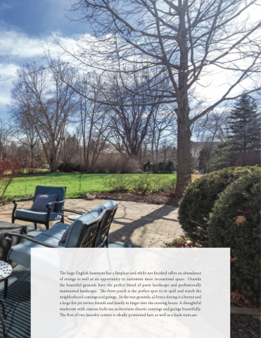 The large English basement has a fireplace and while not finished offers an abundance of storage as well as an opportunity to customize more recreational space. Outside the beautiful grounds have the perfect blend of paver hardscape and professionally maintained landscape. The front porch is the perfect spot to sit spell and watch the neighborhood comings and goings. In the rear grounds, al fresco dining is a breeze and a large fire pit invites friends and family to linger into the evening hours. A thoughtful mudroom with custom built-ins orchestrates chaotic comings and goings beautifully. The first of two laundry centers is ideally positioned here as well as a back staircase.