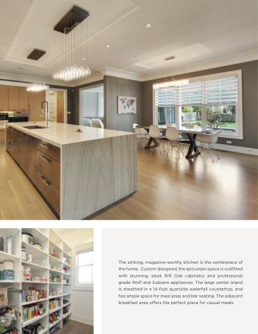 The striking, magazine-worthy kitchen is the centerpiece of the home. Custom designed, the epicurean space is outfitted with stunning, sleek Rift Oak cabinetry and professional grade Wolf and Subzero appliances. The large center island is sheathed in a 14-foot quartzite waterfall countertop, and has ample space for meal prep and bar seating. The adjacent breakfast area offers the perfect place for casual meals.